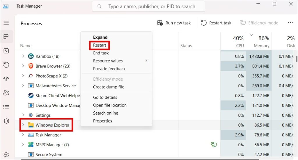 2. Käynnistä Windows Explorer uudelleen