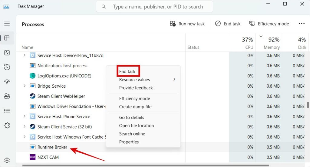 1. Avaa Windowsin Resurssienhallinta (Ctrl+Shift+Esc) uudelleen ja etsi RuntimeBroker-prosessi. Napsauta sitä hiiren kakkospainikkeella ja valitse Lopeta tehtävä.
