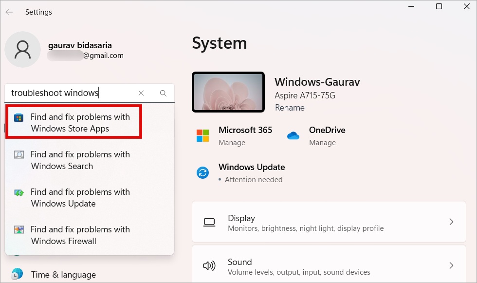 1. Avaa Windowsin asetukset (Windows+I) uudelleen ja hae Etsi ja korjaa Windows Store-sovellusten ongelmia. Avaa se. Huomaa, että vaikka Microsoft on nimennyt Windows Storen uudelleen Microsoft Storeksi, nimi ponnahtaa silti esiin siellä täällä Windows-käyttöjärjestelmässä.