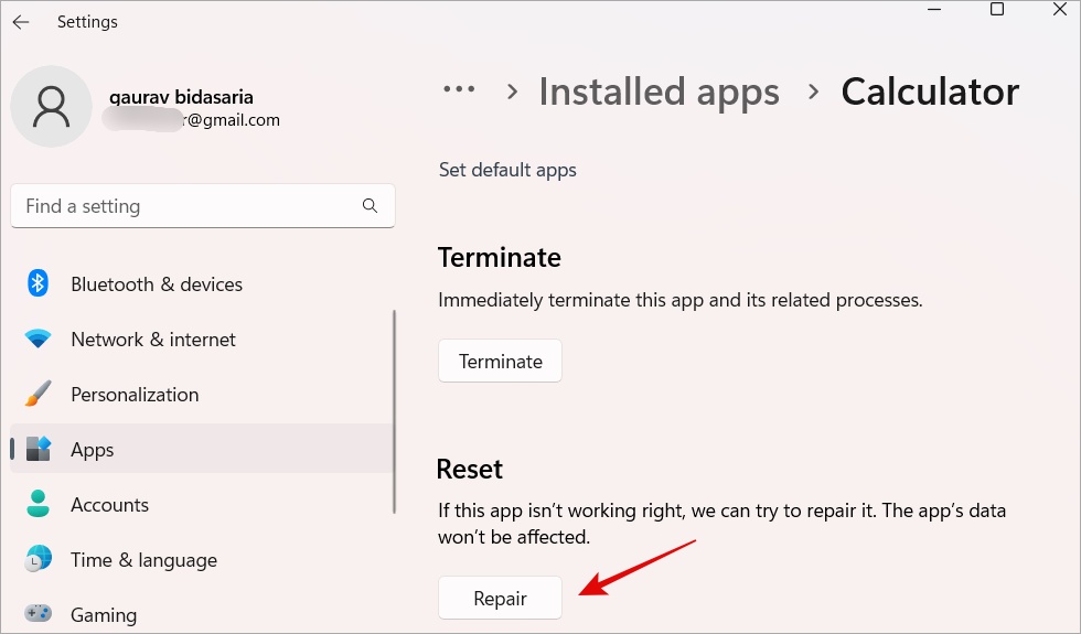 1. Palaa takaisin samaan valikkoon mistä löysit Lopeta-vaihtoehdon, ja napsauta Korjaa-painiketta tällä kertaa.