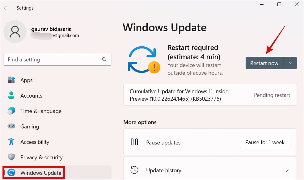 1. Avaa Windowsin asetukset painamalla Windows+I ja siirry kohtaan Windows Update. Jos päivitys on asennettu, näet Käynnistä uudelleen nyt-painikkeen. Jos ei, tarkista, onko niitä.