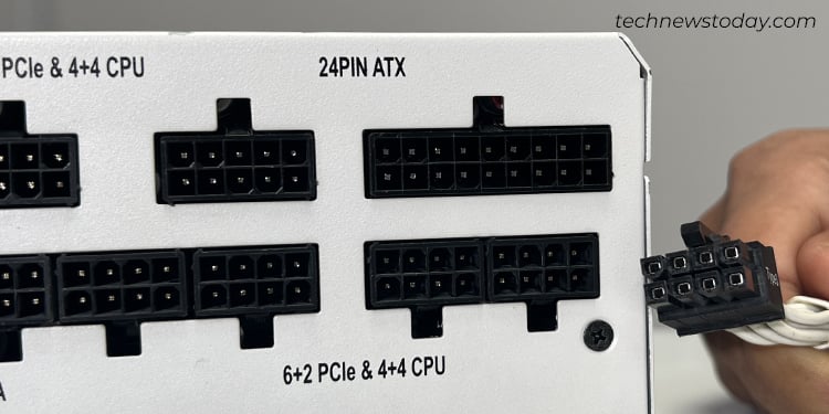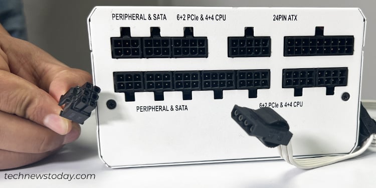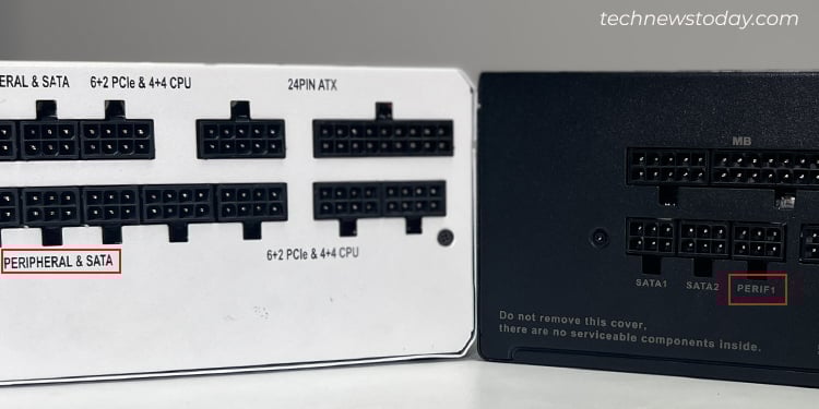PSU-puolella liittimessä on 6 nastainen sarja ja vastaava portti, jossa lukee”PERIF“tai”PERIPHERAL & SATA“muodostaaksesi yhteyden. Jos sinulla on ongelmia liittimen kanssa, voit myös tutustua kattavaan oppaaseemme SATA-virtakaapelin liittämisestä.