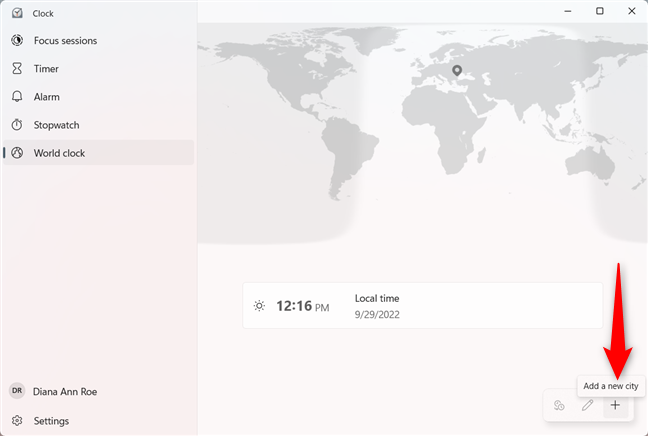 Maailmakello-paneelista näet paikallisen ajan sekä sen, onko eri puolilla maailmaa päivä vai yö – kartan tummemmat alueet osoittavat yön. Jos kuitenkin tarvitset sijainnille tarkan ajan, sinun on ensin lisättävä se Maailmankelloon. Aloita napsauttamalla tai napauttamalla + (Lisää uusi kaupunki)-painiketta oikeassa alakulmassa.