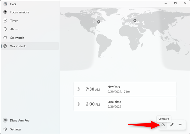 Jos haluat verrata eri sijaintipaikkojen aikaa, paina Vertaa-painiketta valikkopalkista oikeassa alakulmassa-sen kuvakkeessa on kaksi kelloa.