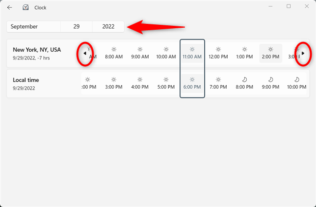 Voit nyt selvästi vertailla aikoja eri kaupunkien välillä lista. Napsauta tai napauta yläreunassa olevia kalenteritietoja valitaksesi toisen päivämäärän. Voit myös napsauttaa tai napauttaa toista ajankohtaa, vierittää pitäen hiiren osoittimen minkä tahansa kaavion rivin päällä tai käyttää kunkin rivin päässä olevia nuolia vertaillaksesi muita aikoja.