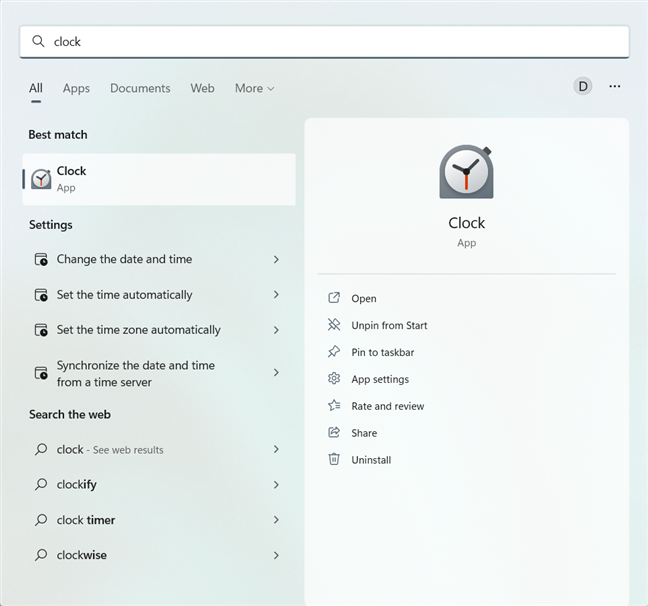Jos haluat käyttää maailmankelloa, sinun on ensin avattava Kello-sovellus. Kirjoita kello tehtäväpalkin hakupalkkiin Windows 10:ssä tai hakuikkunaan Windows 11:ssä (avaa se tehtäväpalkin suurennuslasilla). Napsauta tai napauta sitten Kello-sovelluksen hakutulosta.