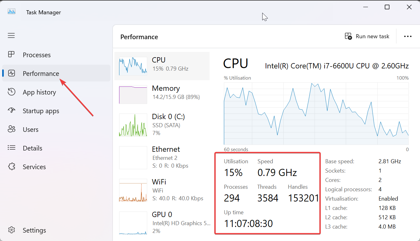 Paina Ctrl + Vaihto + Esc. Klikkaa kolmea vaakaviivaa vasemmassa yläkulmassa ja valitse Suorituskyky. Napsauta nyt CPU ja tarkista käyttöaste, nopeus ja säikeet.