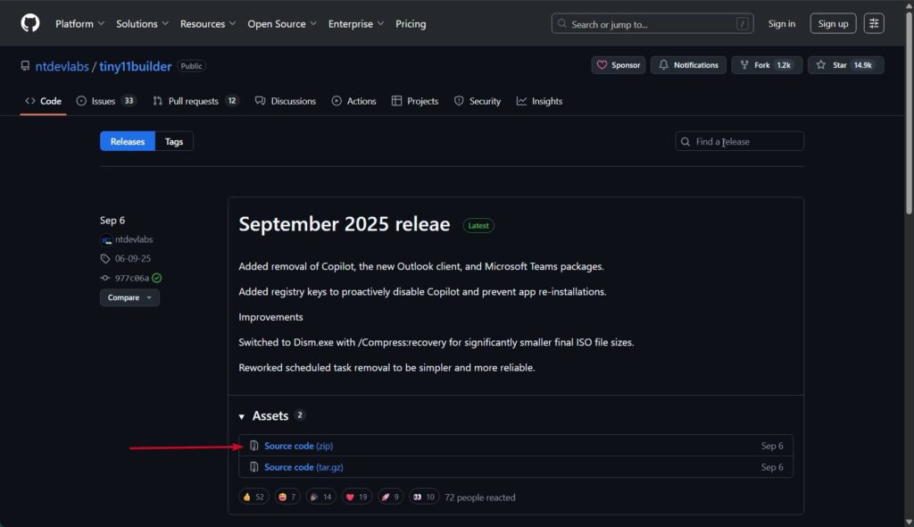 Käy virallisessa NTDEV Tiny11 Builderin GitHub-tietovarastoon. Ja napsauta Julkaisut-osiota.