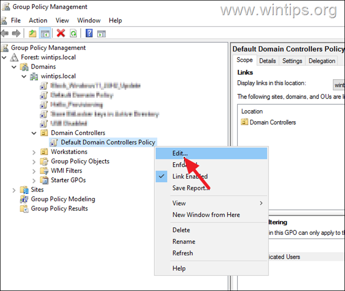 1. Laajenna Group Policy Management -konsolissa (gpmc.msc) kohdassa Domains > YOURDOMAIN, Domain Controllers ja Domain Controllers ja sittenDomain Controllers Verkkotunnuksen ohjaimien käytäntö.