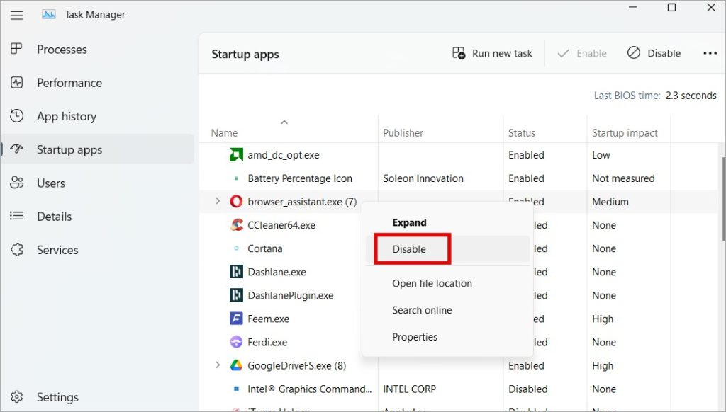 2. Vous pouvez vérifier si l’application est configurée pour se lancer au démarrage dans la colonne État. Sélectionnez une application, faites un clic droit et sélectionnez Désactiver pour désactiver le lancement de l’application de démarrage.