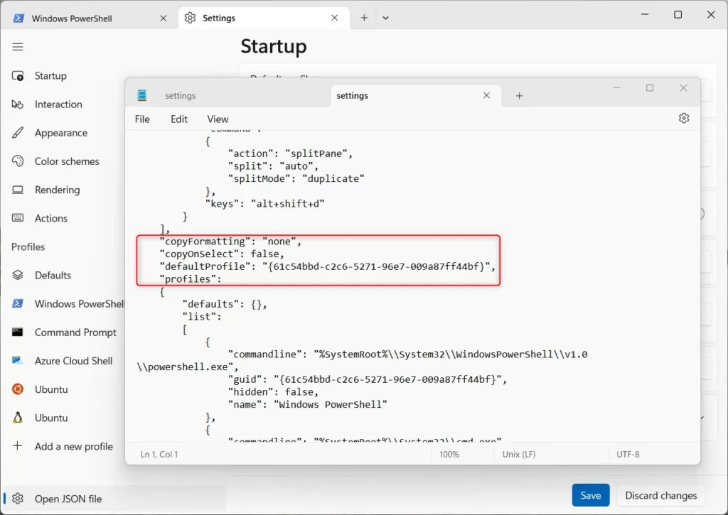 Windows Terminal ouvre la section de configuration du fichier JSON