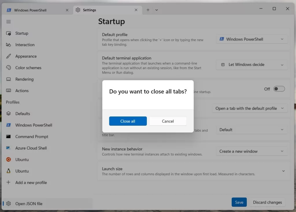Lorsque vous fermez le terminal Windows avec plusieurs onglets ouverts, vous recevez un message d’avertissement”Voulez-vous fermer tous les onglets ?“.
