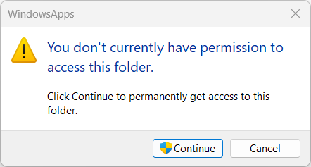 Un autre problème est que vous ne pouvez pas ouvrir le dossier WindowsApps à partir de l’explorateur de fichiers. Windows 11 vous indiquera que vous n’êtes actuellement pas autorisé à accéder à ce dossier.