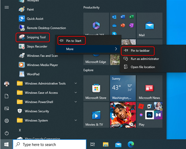 6. Comment ouvrir rapidement Snipping Tool en l’épinglant à votre barre des tâches ou à votre menu Démarrer