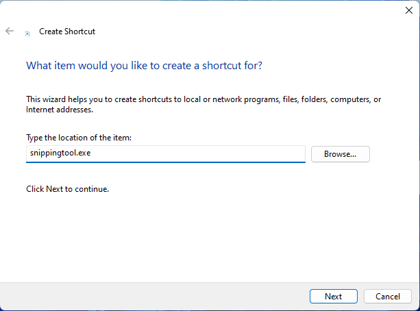 Une autre méthode consiste à créer manuellement un raccourci de l’outil Capture. Cliquez avec le bouton droit ou appuyez longuement sur l’espace vide du bureau, puis sélectionnez Nouveau > Raccourci. Assurez-vous d’entrer snippingtool.exe comme emplacement du raccourci et suivez les instructions de l’assistant Créer un raccourci.