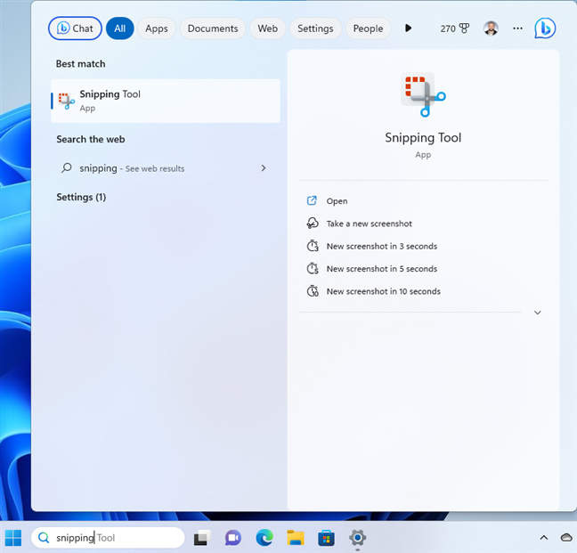 Dans Windows 11, un moyen rapide d’ouvrir l’outil de capture consiste à cliquer ou à appuyer dans la zone de recherche de la barre des tâches ou à appuyer sur la touche Windows. Ensuite, tapez le mot capture et lorsque vous voyez le résultat de la recherche de l’outil de capture, appuyez sur Entrée sur votre clavier ou cliquez ou appuyez sur le résultat. Notez que sur le côté droit du résultat de la recherche, vous avez également des options pour prendre des captures d’écran immédiatement.