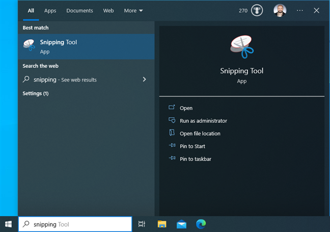 De même, dans Windows 10, cliquez ou appuyez sur dans la zone de recherche, puis tapez snipping. Vous devriez voir le résultat de recherche approprié presque immédiatement. Cliquez ou appuyez dessus pour démarrer l’application, ou appuyez sur Entrée sur votre clavier.