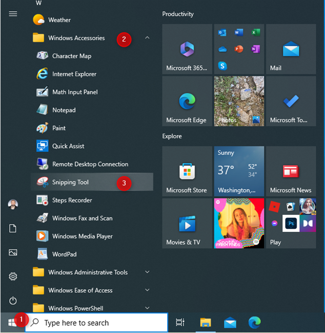 Si vous utilisez Windows 10, cliquez ou appuyez sur l’icône Windows dans la barre des tâches, faites défiler la liste des applications jusqu’à la lettre W et ouvrez les accessoires Windows dossier. Vous y trouverez le raccourci Snipping Tool. Cliquez ou appuyez dessus, et l’application est lancée.