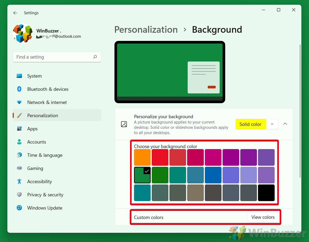 Pour”Couleur unie”, vous pouvez choisir l’un des préréglages ou choisissez”Couleurs personnalisées”
