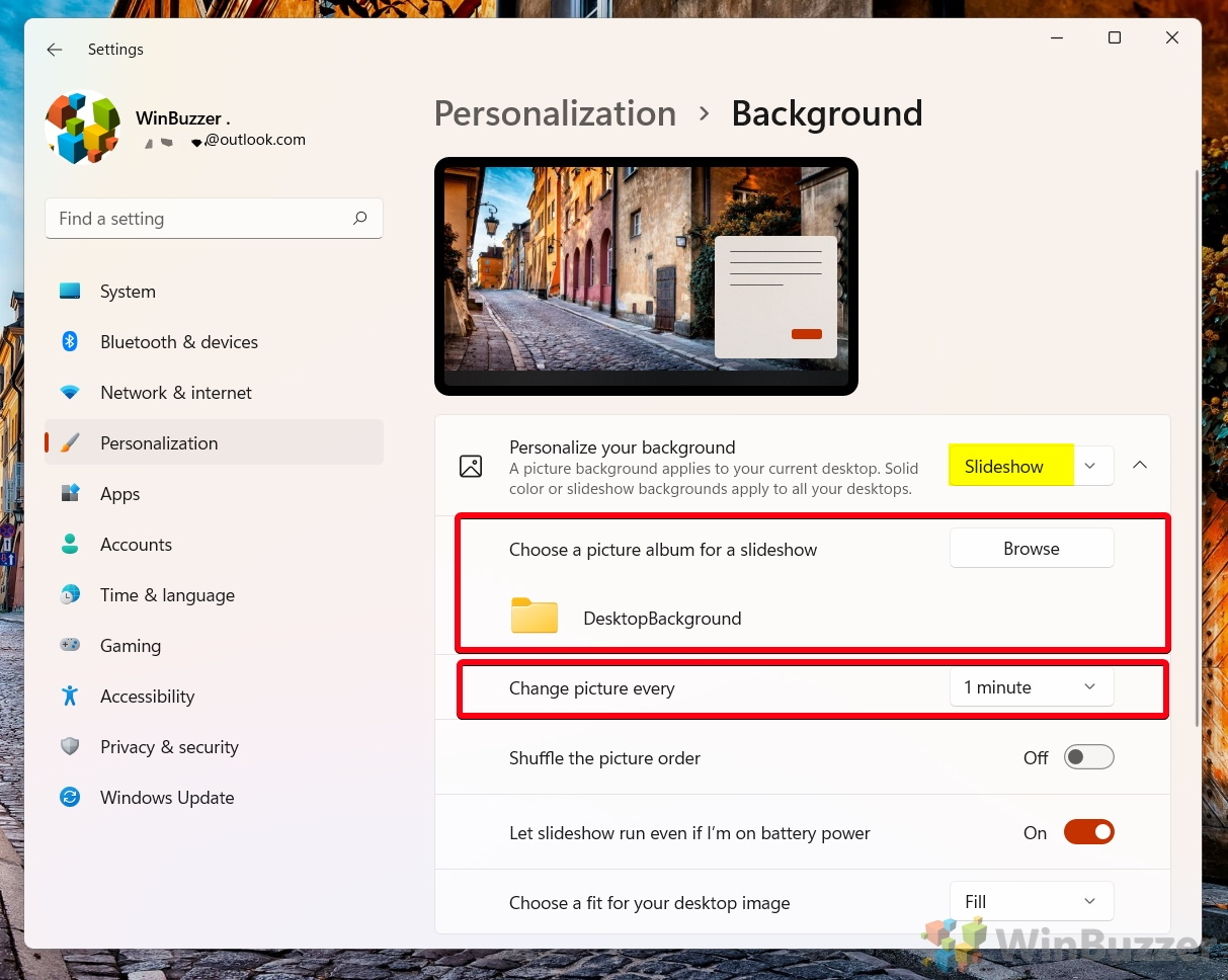 Vous pouvez laisser Windows modifier l’image automatiquement de 1 minute à une fois par jour. Par défaut, Windows modifiera les images par ordre chronologique en fonction de leur nom de fichier. Vous pouvez également choisir”Mélangez l’ordre des images”, ce qui est pratique pour les ensembles d’images étendus.