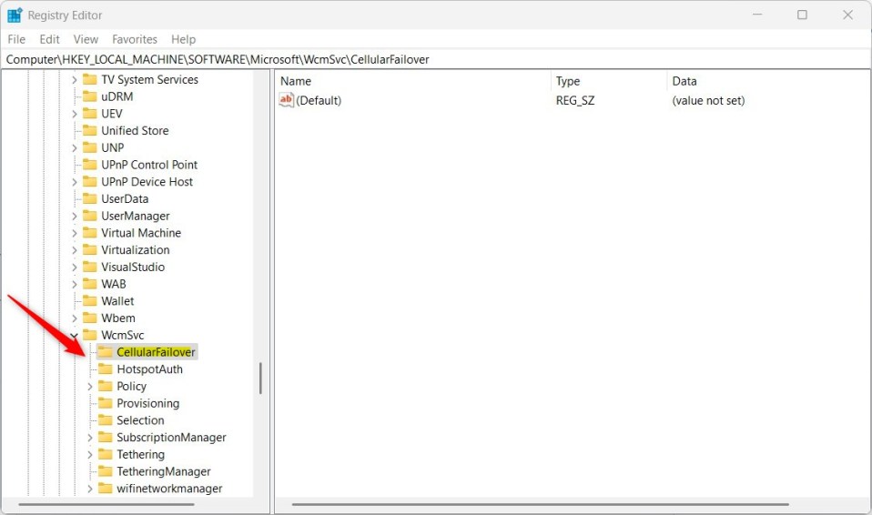 Si vous ne voyez pas la clé de dossier CellularFailover , faites un clic droit sur la clé parent WcmSvc , puis créez le dossier de sous-clé (CellularFailover).