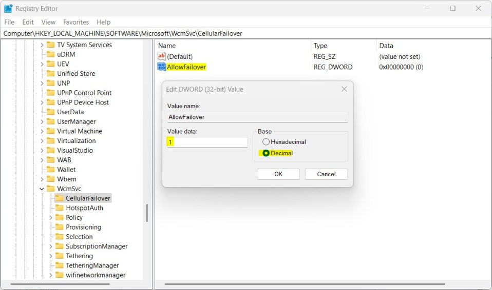 HKEY_LOCAL_MACHINE\SOFTWARE\Microsoft\WcmSvc\CellularFailover