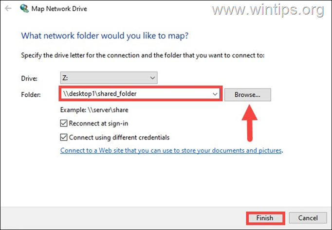 3. Dans la fenêtre”Mapper un lecteur réseau”, procédez comme suit et cliquez sur Terminer :