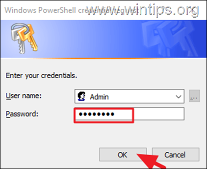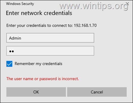 3b. À la”demande d’informations d’identification”fenêtre, tapez le mot de passe pour le partage réseau et appuyez sur OK.