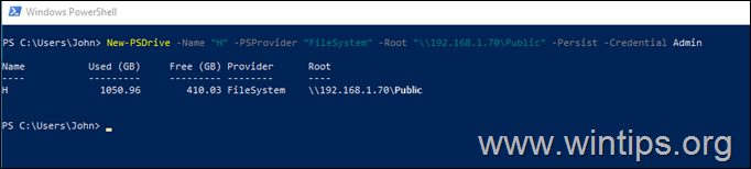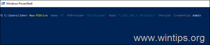 New-PSDrive-Name”H”-PSProvider”FileSystem”-Root”\\192.168.1.70\Public”-Persist-Credential Admin