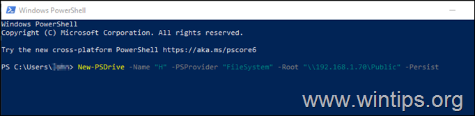 2. Dans PowerShell, donnez la commande suivante pour mapper le lecteur réseau et appuyez sur Entrée :*