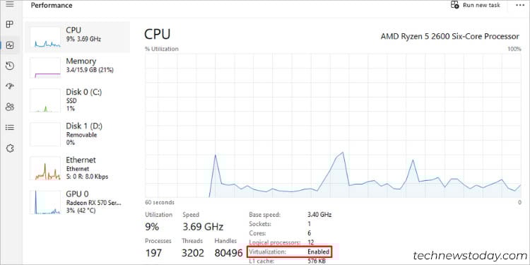 Une fois votre système d’exploitation démarré, utilisez Ctrl + Maj + Échap raccourci clavier pour ouvrir le Gestionnaire des tâches. Accédez à l’onglet Performances et sélectionnez CPU. À droite, recherchez l’option Virtualisation. Il doit indiquer”Activé”.