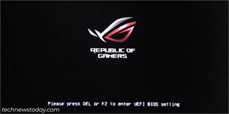 Cependant, certains modèles ASUS utilisent F2. Donc, si Del ne fonctionne pas, redémarrez l’ordinateur, et cette fois, appuyez sur F2 dès que vous rencontrez le premier logo ROG/ASUS/TUF.