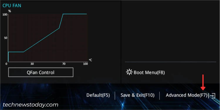 Dans la plupart des systèmes, vous entrez dans l’utilitaire ASUS EZ après avoir utilisé la clé BIOS dédiée. Mais comme vous ne pouvez pas modifier les paramètres de virtualisation ici, vous devez passer en mode avancé. Suivez les instructions ci-dessous pour savoir quoi faire ensuite :