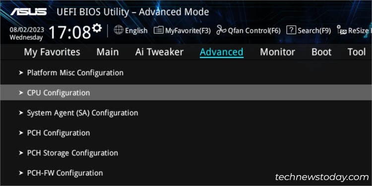 Ensuite, sélectionnez CPU Configuration. C’est là que se trouvent les paramètres de virtualisation de votre BIOS.