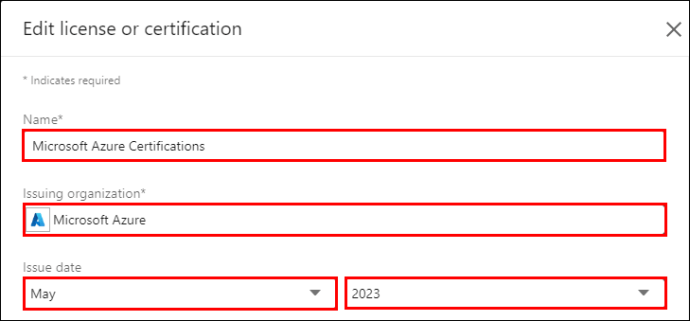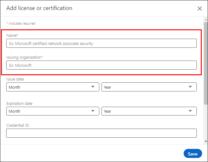 Type votre nom de certification dans le « Champ Nom ». Sous le champ Nom, saisissez le nom de l’organisation émettrice et sélectionnez-le dans le menu déroulant. Seules les organisations disposant d’une page LinkedIn apparaissent dans le menu déroulant après avoir saisi leur nom.Si votre certificat n’a pas de date d’expiration, cochez « Ceci”Le certificat n’expire pas”et choisissez la date d’émission. Décochez l’option si votre certificat a une date d’expiration et entrez les dates d’émission et d’expiration.