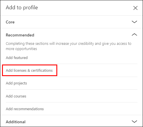 Si vous obtenez l’un des certificats LinkedIn, vous pouvez l’ajouter à votre profil comme suit :