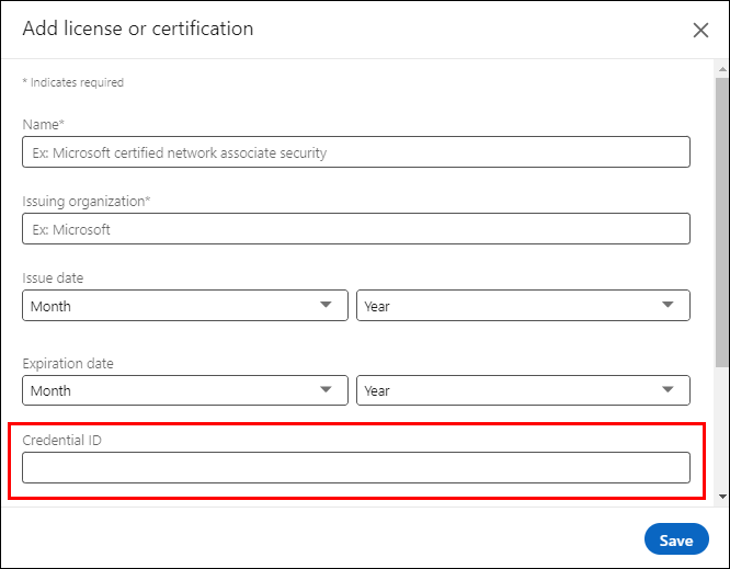 LinkedIn ne vous permet pas de télécharger votre certificat pour prouver que vous l’avez obtenu. Au lieu de cela, la page Licence et certifications comporte une section URL d’identification dans laquelle vous pouvez rediriger quelqu’un pour afficher votre certificat. Si votre certificat est un PDF ou que vous ne pouvez pas y accéder depuis le site Web de l’émetteur, créez un lien avant de remplir le formulaire de certification sur LinkedIn.