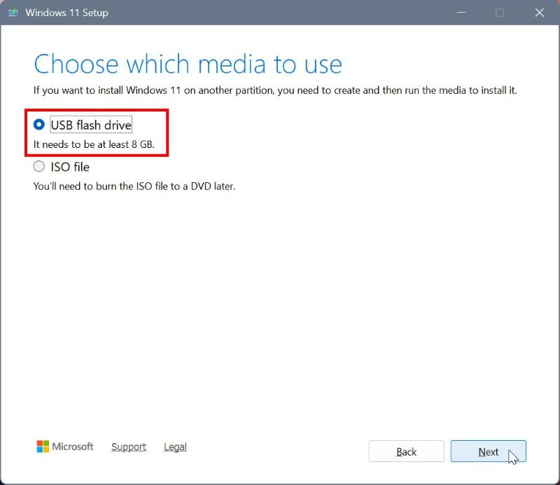 Vous pouvez également créer un lecteur amorçable pour Windows 11 25H2 à l’aide de l’utilitaire Microsoft, Outil de création de support. Cette méthode est particulièrement utile si vous ne disposez pas déjà du fichier ISO.
