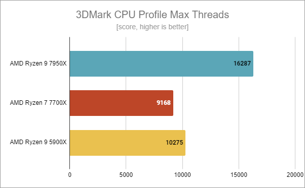 Avant de passer aux tests jeux, j’ai exécuté la référence de jeu synthétique CPU Profile de 3DMark. Celui-ci tente d’évaluer les performances de jeu des processeurs lors de l’utilisation de différents nombres de cœurs. Comme les meilleurs jeux de nos jours savent tirer parti de plusieurs cœurs, j’ai choisi de regarder les scores de tous les threads. L’AMD Ryzen 7 7700X a obtenu 9168 points, ce qui est un excellent résultat pour un processeur à huit cœurs !