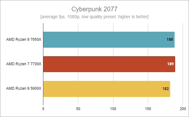 Dans Cyberpunk 2077, les trois processeurs ont rendu plus de 180 images par seconde, et les trois scores étaient très proches , bien que la génération précédente Ryzen 9 5900X était un peu plus lente. Un goulot d’étranglement GPU a peut-être fait surface ici, mais dans tous les cas, ce sont des résultats impressionnants pour les trois processeurs !