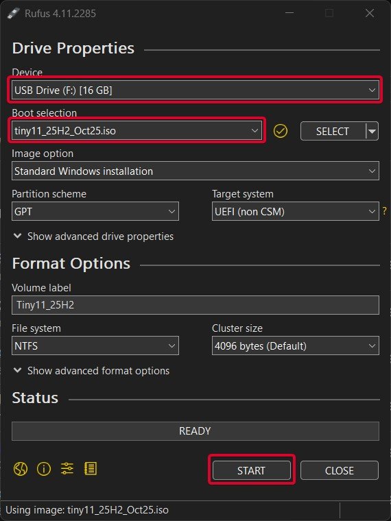 Ouvrez Rufus et insérez la clé USB dans le PC. Sélectionnez la clé USB dans la section Périphérique, le fichier iso Tiny11 dans la section Sélection de démarrage en appuyant sur le bouton SELECT, puis sélectionnez Schéma de partition, Système cible ou Système de fichiers, le cas échéant. Et puis appuyez sur le bouton START. Branchez la clé USB sur le système sur lequel vous souhaitez installer Tiny11 25H2 et redémarrez le système. Lors du démarrage, appuyez sur la touche du menu de démarrage avant le logo Windows pour l’ouvrir.