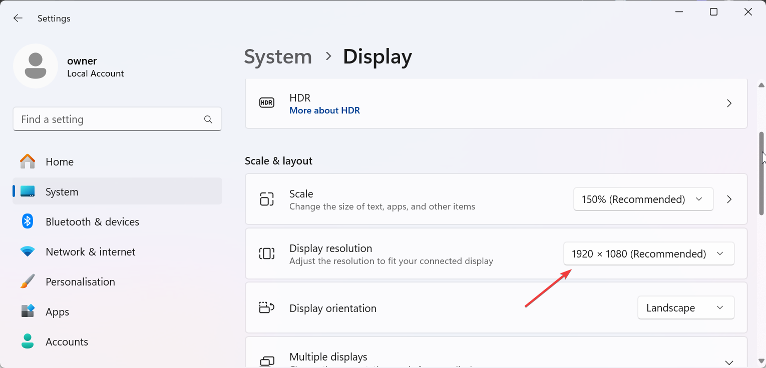 Pour ce faire, appuyez sur Windows + I pour ouvrir Paramètres, puis Système → Affichage. Maintenant, faites défiler jusqu’à Échelle → Résolution d’affichage. Choisissez la résolution recommandée ou native pour votre moniteur HDMI.