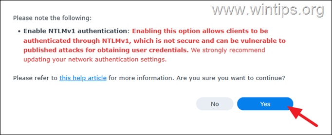 La méthode finale, MAIS NON SÉCURISÉE* pour résoudre le problème susmentionné consiste à activer l’authentification NTLMv1 sur votre périphérique Synology NAS. Pour ce faire, suivez les étapes ci-dessous :