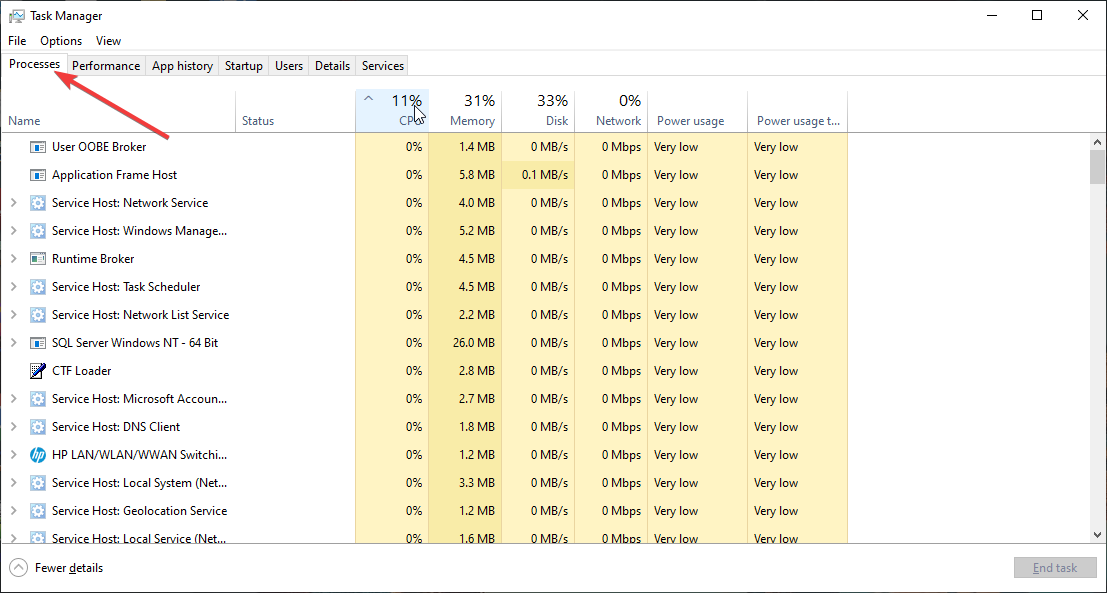 Pour voir l’utilisation du processeur par application, cliquez sur l’onglet Processus en haut et cliquez sur l’en-tête de colonne du processeur pour trier par utilisation la plus élevée. Vous pouvez désormais rechercher des applications ou des services fonctionnant au-dessus des niveaux normaux.