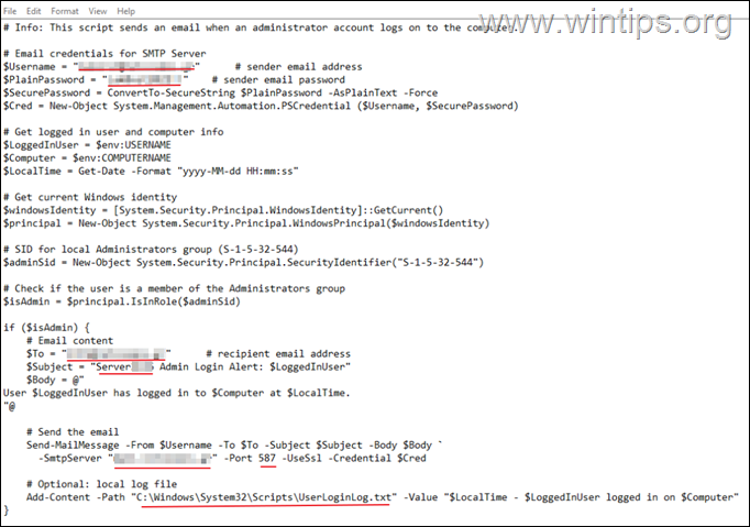 Étape 1. Créez un script PowerShell pour envoyer des notifications par e-mail lorsqu’un administrateur se connecte.