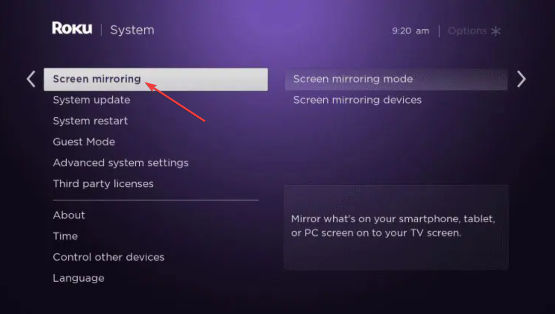 Commencez par ouvrir les Paramètres sur votre Roku. Ensuite, sélectionnez Système, puis Mise en miroir de l’écran. Définissez le mode pour inviter ou toujours autoriser les connexions Android entrantes.