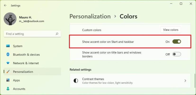 Activez l’option”Afficher la couleur d’accentuation sur le démarrage et la barre des tâches”.