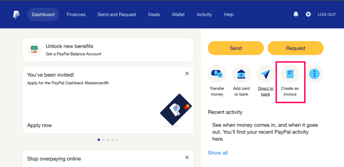 Ouvrez PayPal et connectez-vous à votre compte. Ensuite, appuyez sur Créer une facture.