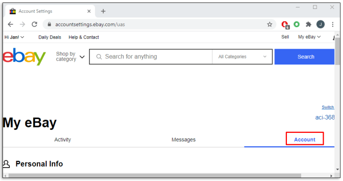 Lorsque la page”Mon eBay”s’ouvre , cliquez sur l’onglet”Compte”.