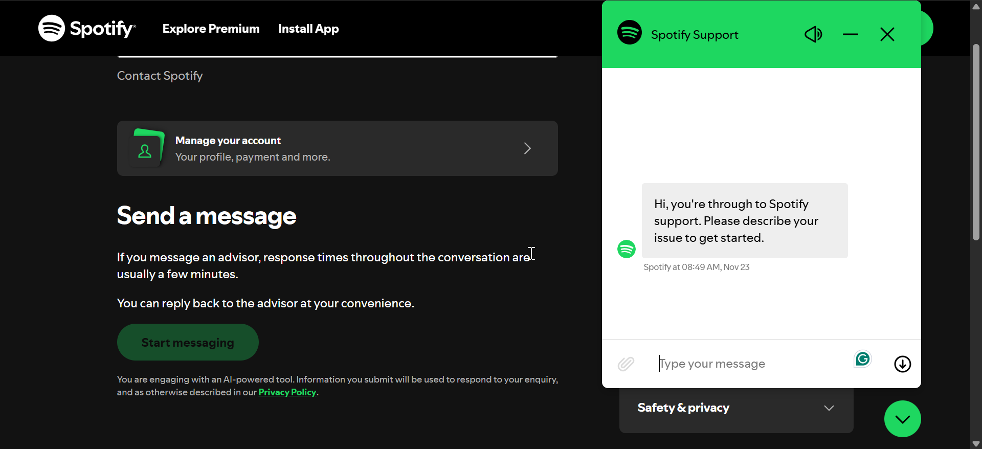 Nyissa meg a Spotify súgóoldalát, és válassza ki a problémának megfelelő kategóriát. Ezután válassza ki a Csevegés lehetőséget, írja le a problémát, és kövesse az utasításokat.